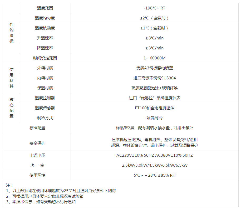 注: 1、以上數(shù)據(jù)均在使用環(huán)境溫度為25℃時(shí)且通風(fēng)良好條件下測(cè)得 2、可根據(jù)用戶具體要求定做非標(biāo)深冷試驗(yàn)箱 3、本技術(shù)信息,如有變動(dòng)恕不另行通知 |