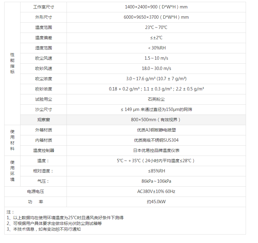 注: 1、以上數據均在使用環境溫度為25℃時且通風良好條件下測得 2、可根據用戶具體要求定做非標光伏防塵測試箱等 3、本技術信息,如有變動恕不另行通知 |