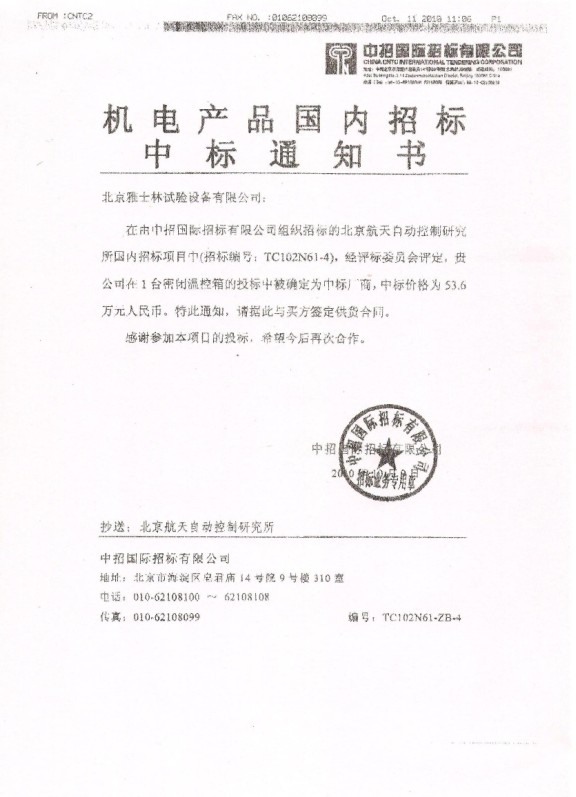 金秋十月,秋高氣爽!由中招國際招標有限公司精心組織,在北京航天自動控制研究所2010年國內項目二期招標中,北京雅士林試驗設備有限公司憑借強大的綜合實力,以各項排名指標均名列前茅的優異成績成功中標密閉溫控箱(招標編號:TC102N61-4)項目工程。中標金額為53.6萬元人民幣。 北京航天自動控制研究所2010年密閉溫控箱工程項目是該所2010年的重點項目。該項目的成功中標進一步確立了北京雅士林環境試驗設備在航天市場的領先地位,也為北京雅士林的的持續發展樹立了堅實的信心。在環境試驗設備市場競爭空前激烈的情況下,北京雅士林以有效的資源投入、專注的研發、前瞻的設計理念、嚴謹科學的生產管理制度、及時高效專業的工程服務隊伍換來了在技術、產品、市場各方面的良好口碑,并取得了優異的市場成績。