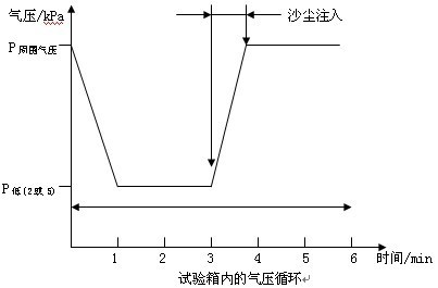 試驗用塵:試驗用塵是干燥的非磨蝕性的細粉塵,能夠通過篩孔為75µm,金屬絲直徑為50µm的平面網狀篩。本試驗中可以使用滑石粉,分析表明它可以滿足要求。試驗用塵使用次數不應超過20次。應注意維持干燥以保持粉塵細度,使用前應在80℃下烘干2h. 塵濃度:試驗用塵的數量應能夠使箱底基準表面上的沉降量均勻維持在(600±200)µ/(m²•h)。 氣流:試驗箱內的氣流應主要是自上而下的垂直氣流,而非層流。 氣流速度:氣流速度應能夠使塵在試驗箱內均勻分布。 濕度:試驗箱內的相對濕度應小于15%?梢酝ㄟ^提高試驗箱濕度實現。 樣品內氣壓:根據樣品的運行條件,樣品外殼可以分為兩種類型: 類型1:樣品外殼內的氣壓可能會與外界大氣壓不同,例如由運行中的熱力循環引起氣壓不同。 類型2:樣品外殼內的氣壓跟外界氣壓相同。 相關規范應闡明樣品外殼類型和壓力降。 砂塵試驗箱對于具有類型1外殼的樣品,應放入試驗箱,并按照正常使用位置安裝。樣品應承受圖中規定的壓降周期。根據相關規范中規定,壓力降應為2kPa(20mbar)或5kPa(50mbar) 。 如圖所示,塵應在每個循環周期內注入。 對于具有類型2外殼的樣品,應放入試驗箱,并按照正常使用位置安裝。此種情況下,不應使用真空泵。