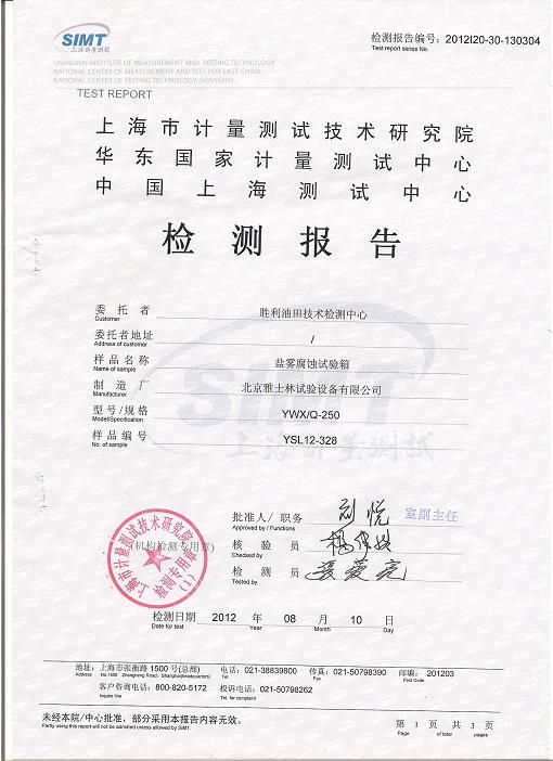 >>鹽霧腐蝕試驗箱檢測報告-上海計量院-勝利油田