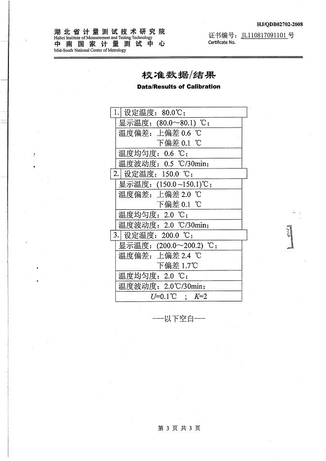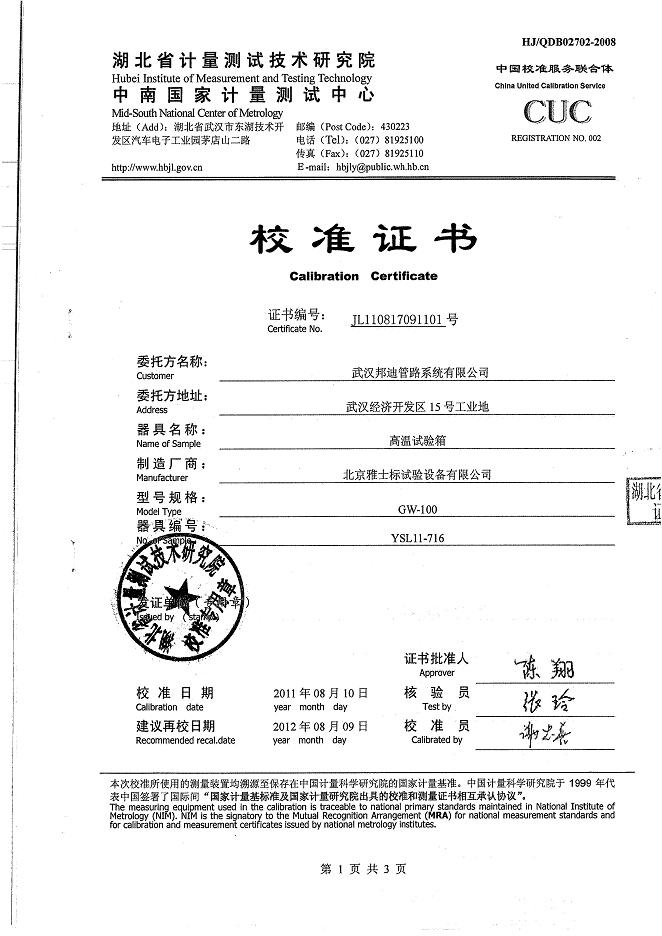 >>高溫試驗箱校準證書-湖北計量院-邦迪集團
