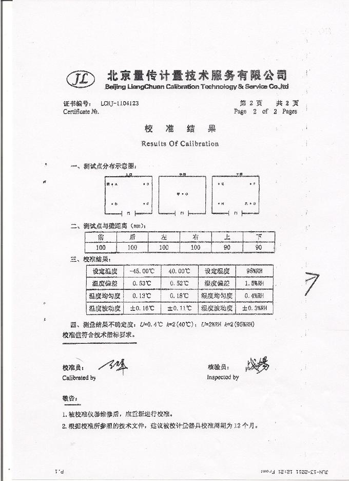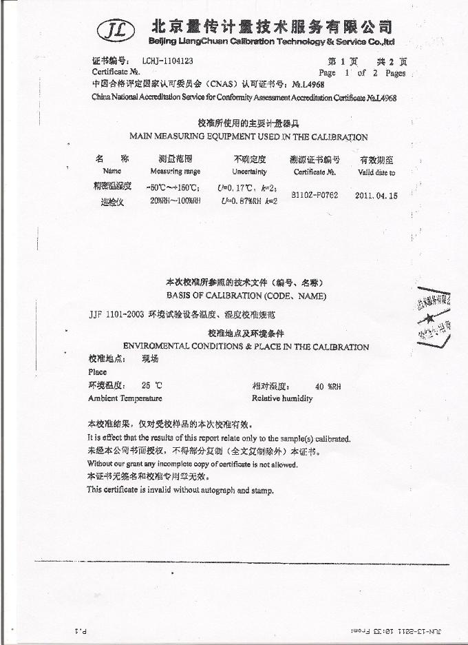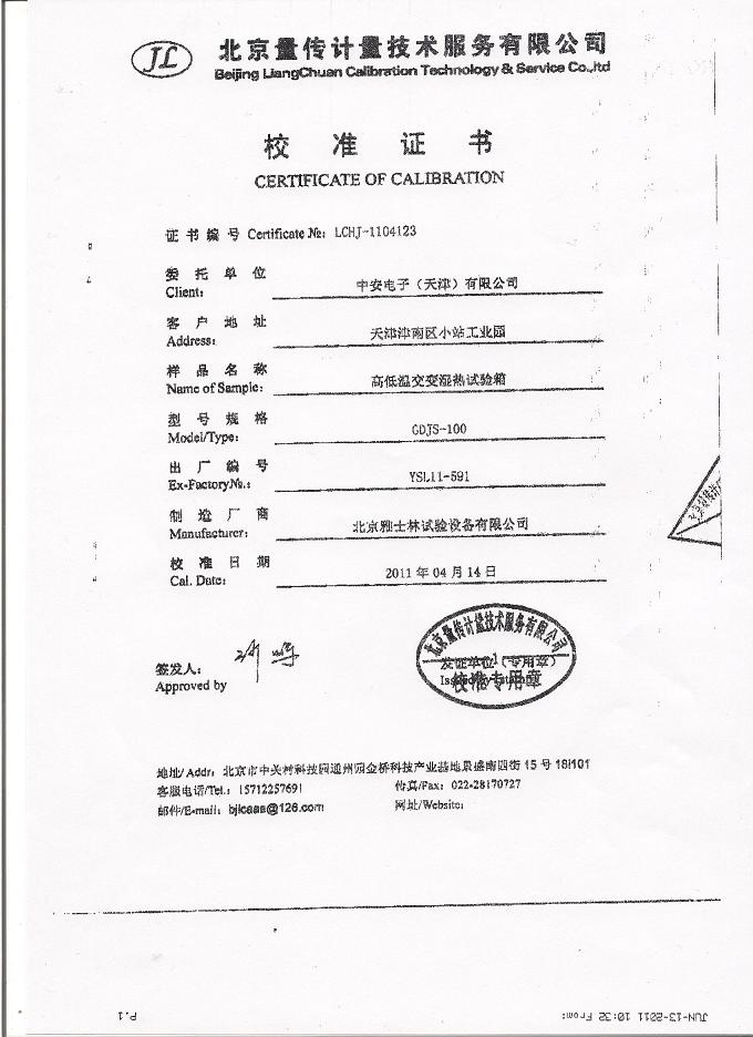 高低溫交變濕熱試驗箱校準證書-北京量傳計量-中安電子