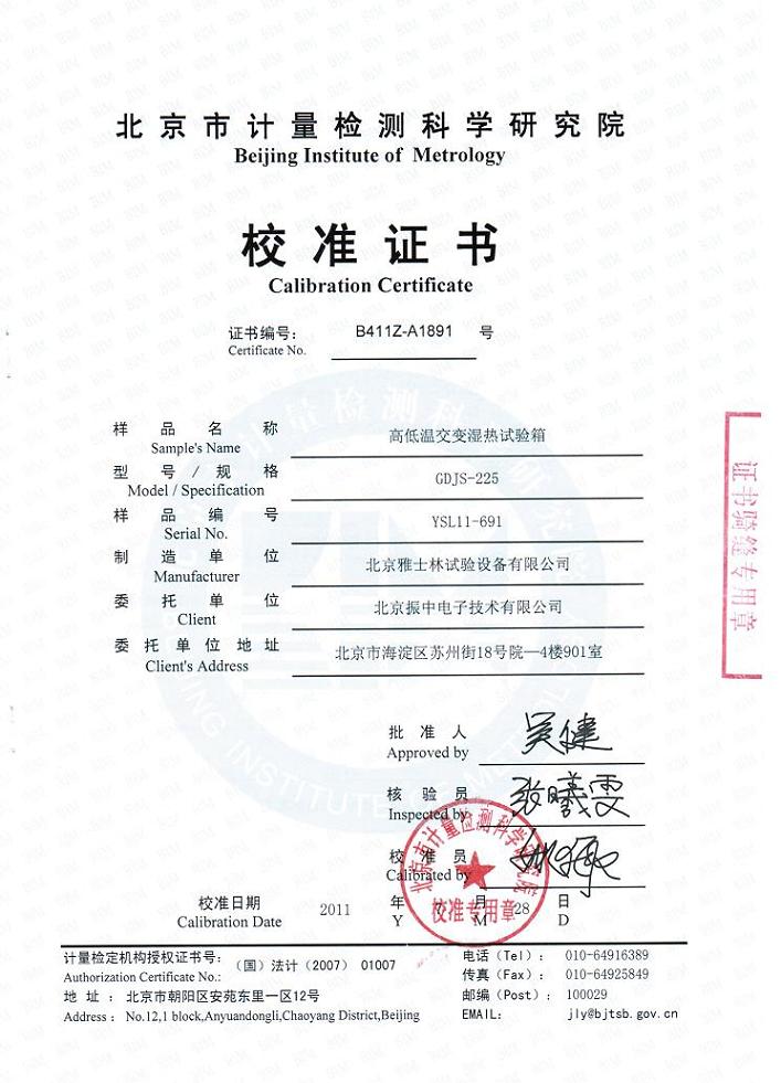 >>高低溫交變濕熱試驗箱校準(zhǔn)證書-北京計量院-振中電子