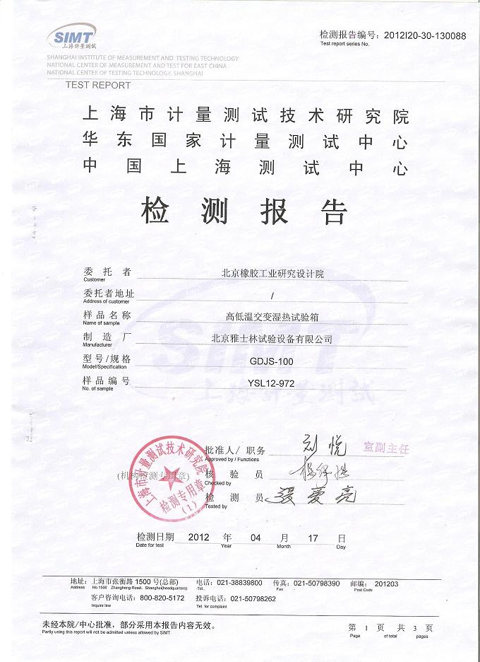 ·高低溫交變濕熱試驗箱檢測報告-上海計量院-北京橡膠院